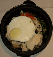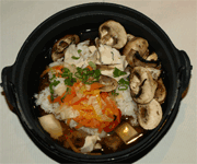 Японский рис и куриная грудка в горячем рыбном бульоне с куриным яйцом, шампиньонами и овощами: пекинской капустой, луком порей, морковью и сладким перцем.