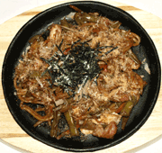 Лапша Соба с курицей на чугунной сковородке. Домашняя японская лапша с куриной грудкой, овощами и хлопьями тунца кацуо-буси. Сверху – специальный соус.