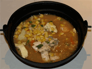 Семга и овощи в горячем рыбном бульоне с соевой пастой Белое Мисо. Картофель, белокочанная капуста, морковь, репчатый лук и сладкая кукуруза.