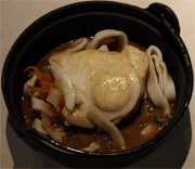 Рисовая лапша и говядина в горячем бульоне с тофу, куриным яйцом, вешенками, луком порей и пекинской капустой.
