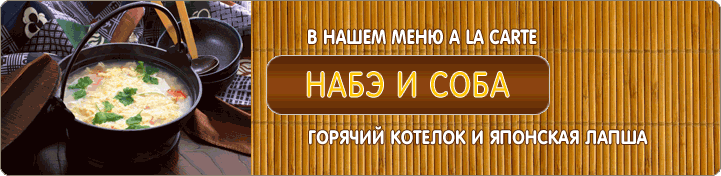 * Набэ и Соба – это блюда из нашего меню на заказ. Меню a la carte действует по будням с 11:30 до 18:00. Заказать блюда можно прямо на линии раздачи.